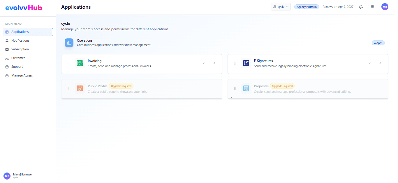 Whether you are a freelancer, an agency, or a growing enterprise, the Evolvv Hub is your central command center. From here, you can access all your core business applications, manage team permissions, and monitor your subscription.